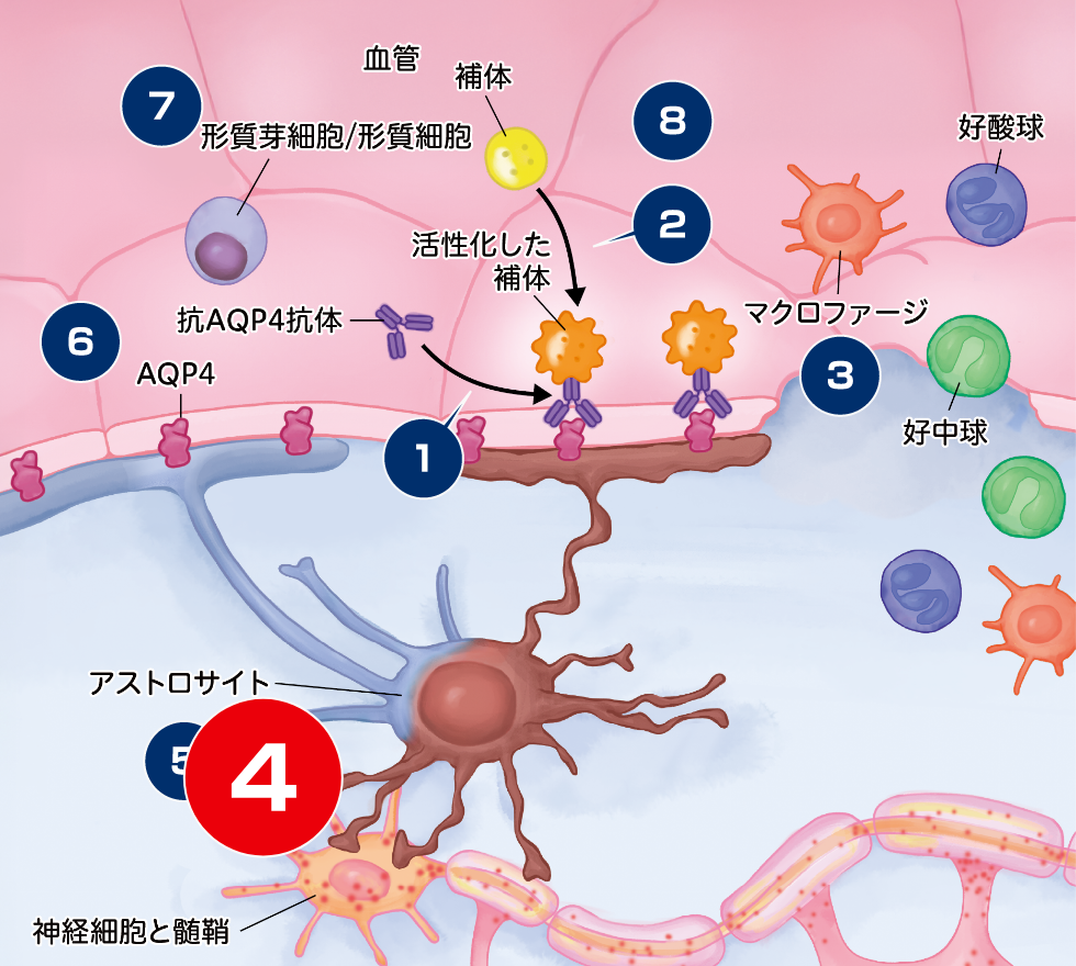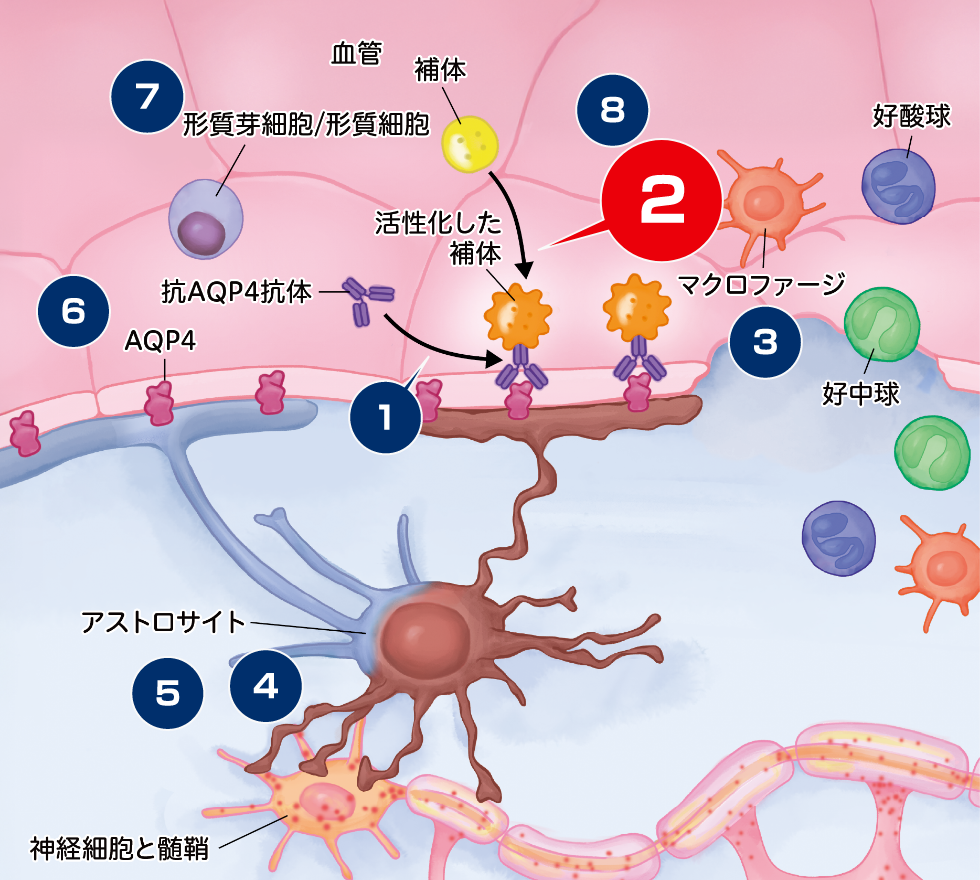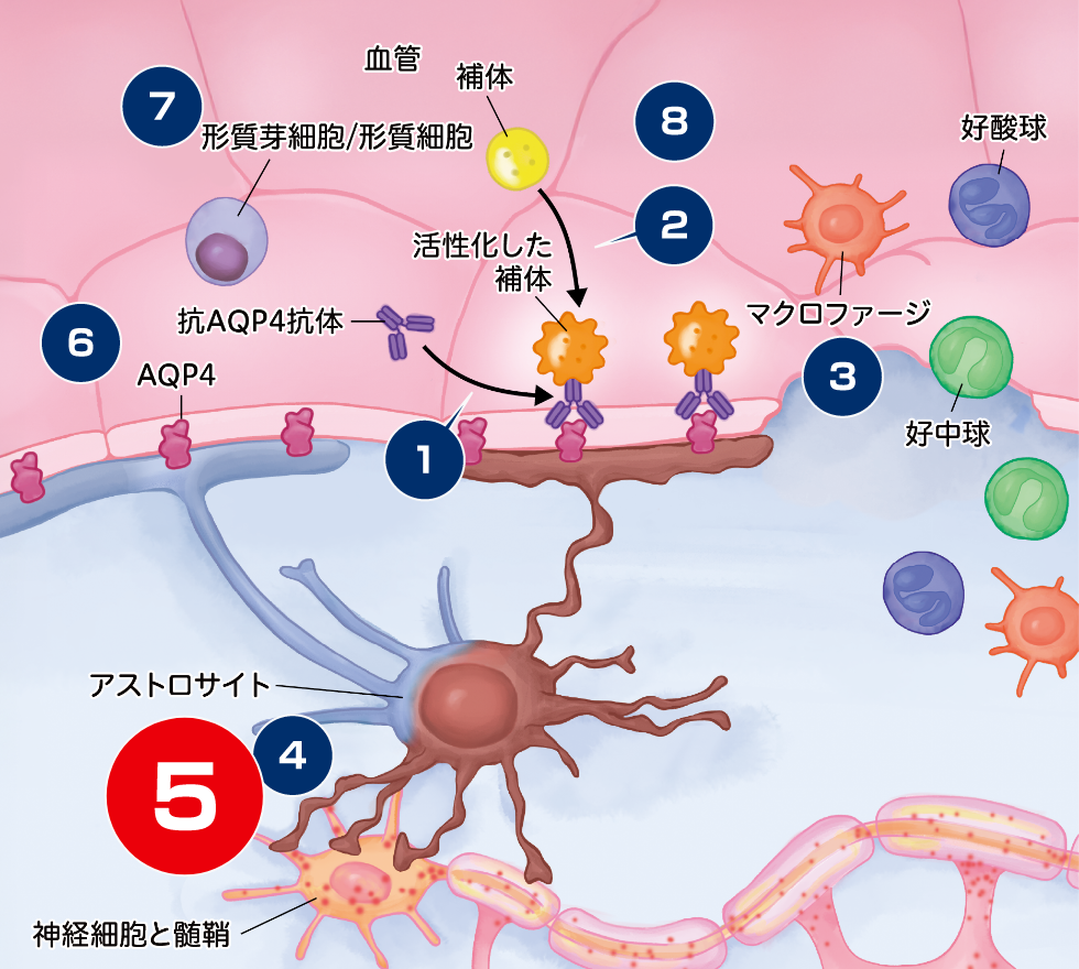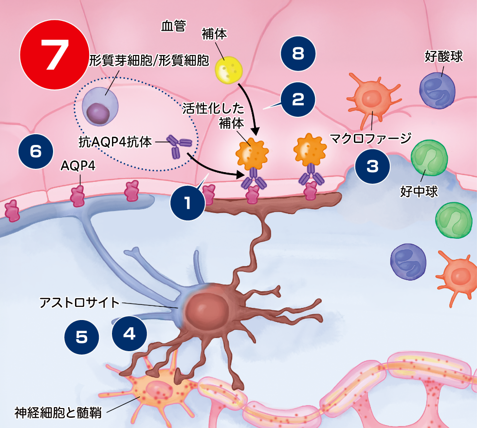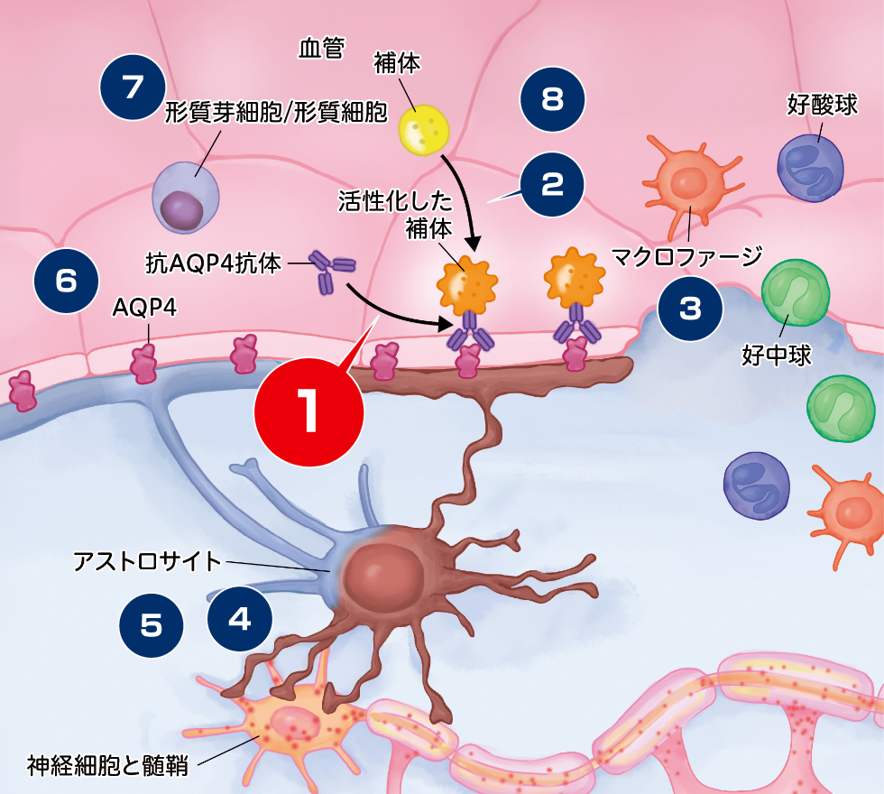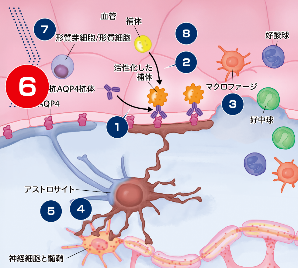 これにより、アストロサイトが破壊され、その後、神経細胞や髄鞘(ずいしょう)も破壊されることで症状を引き起こします。